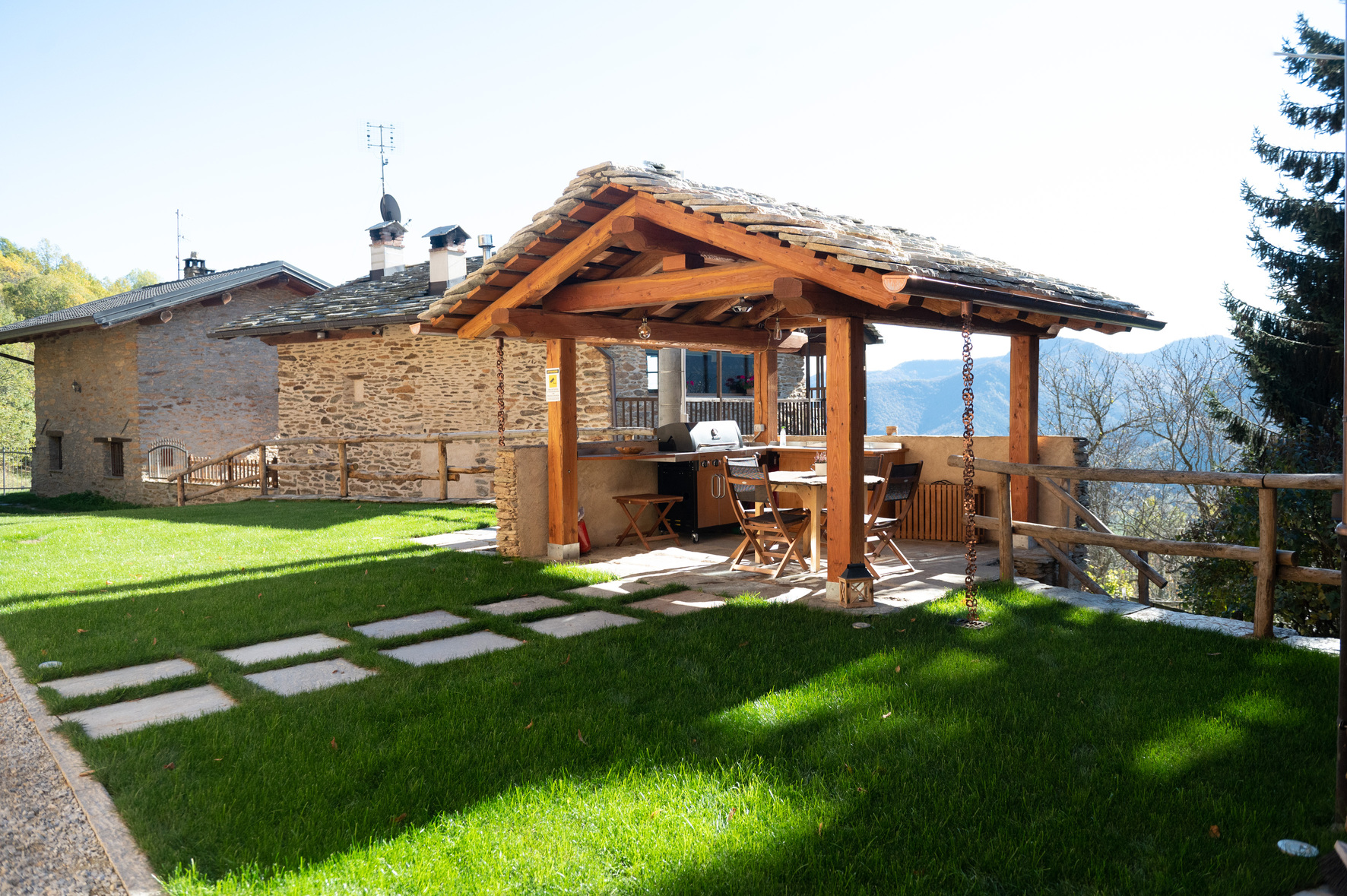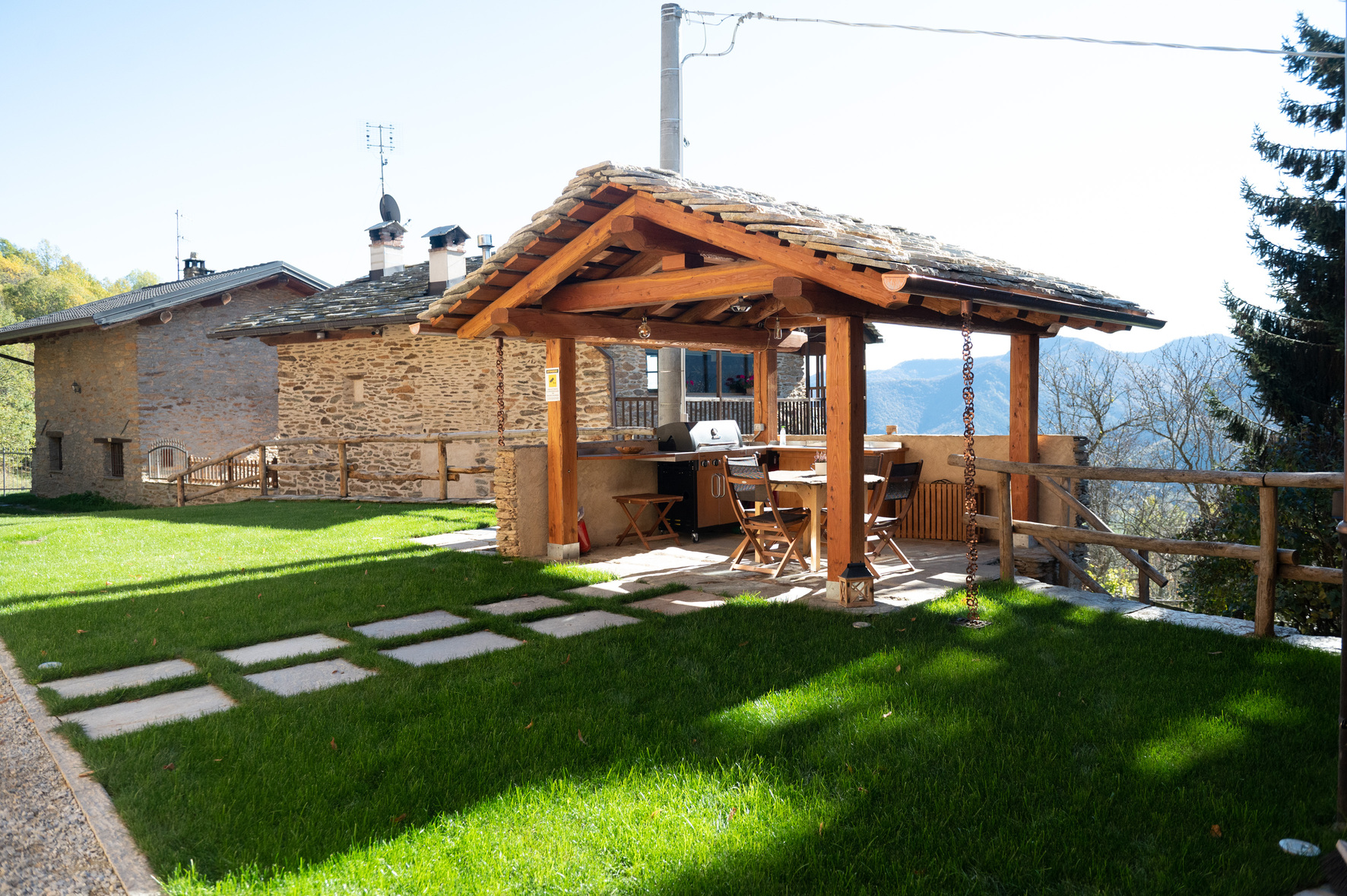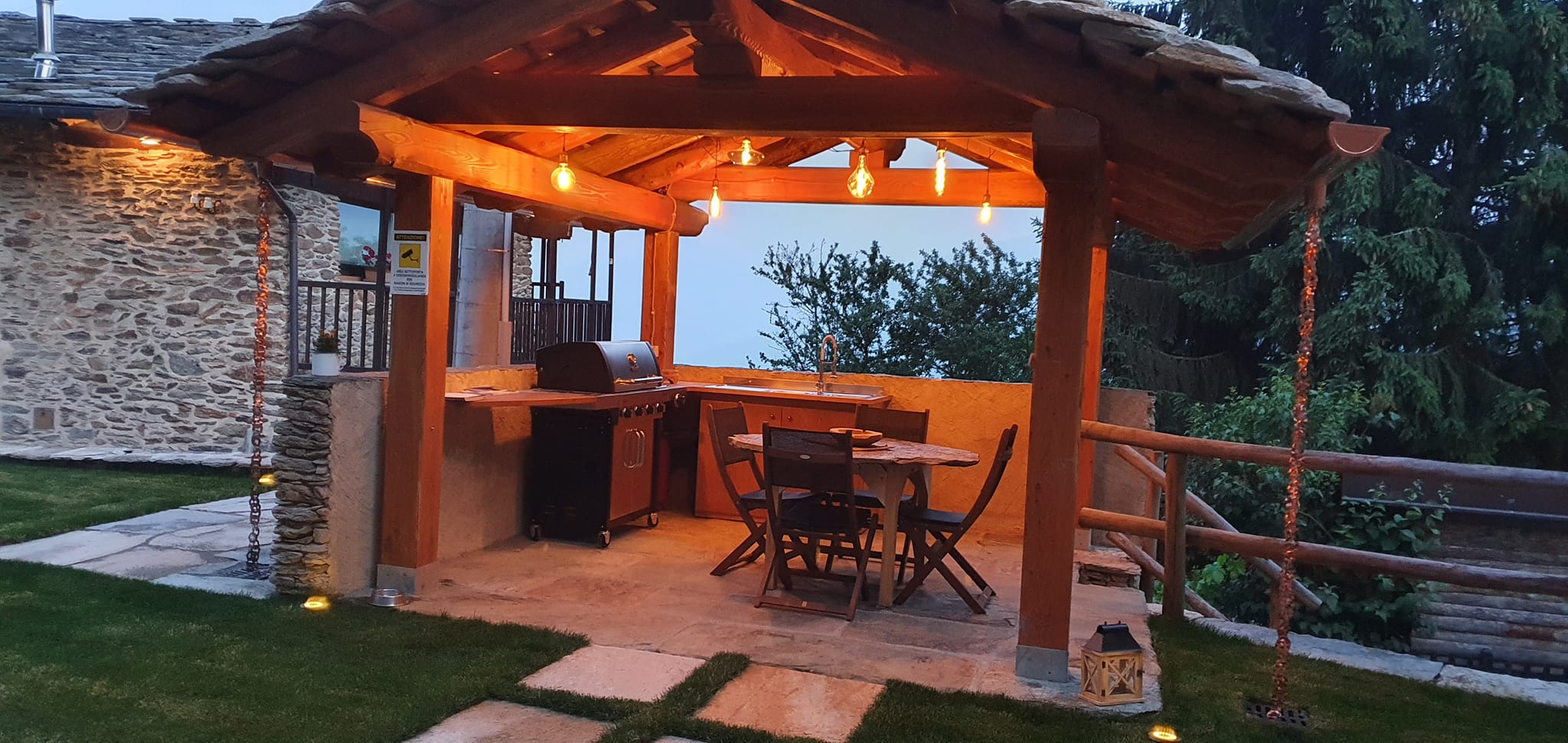 Nell’area esterna attigua è presente un confortevole prato verde sul quale è possibile soggiornare in totale relax godendo del panorama, oltre ad un’area coperta attrezzata.